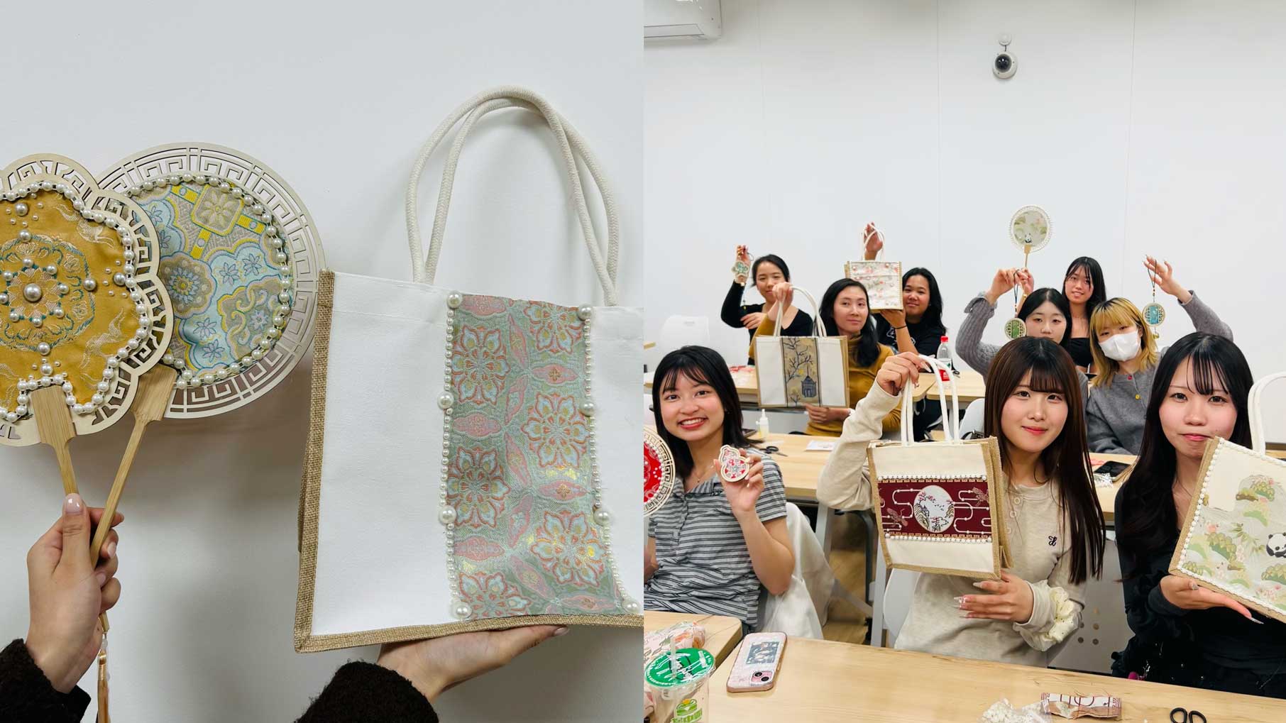 First, the instructor introduced the history and classic patterns of Song Brocade, explaining its role in both traditional attire and modern daily life. Through vivid images and videos, students were captivated by its beauty. After a demonstration of making fans, handbags, and pendants, the students selected their preferred fabrics and began crafting.