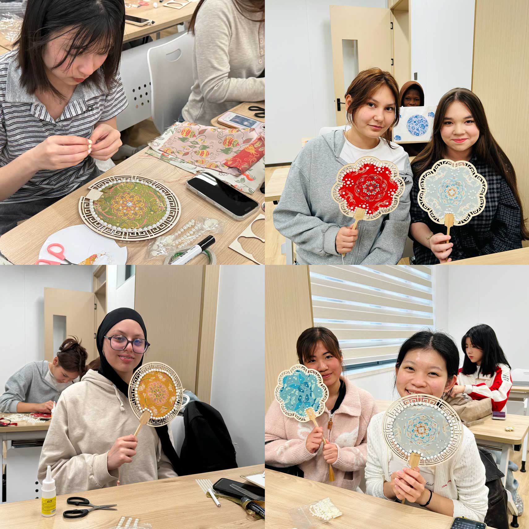 Students carefully cut the brocade into shape, glued it onto the fan frame, and used tweezers to add tiny beads and ornaments. Each fan reflected the students’ unique creativity.