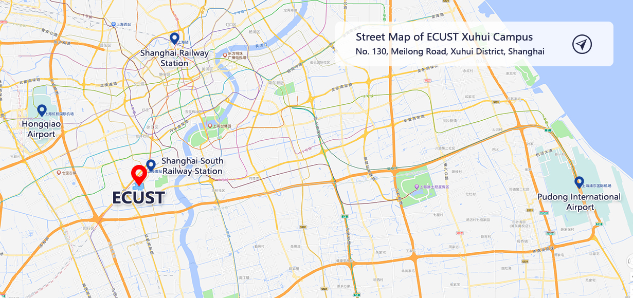 1 Take No.7 shuttle bus to Shanghai South Railway Station, and then take Line 15 to ECUST station, or take bus No.111, 156 or 761 to the east gate of ECUST, or take bus No. 729 or 157 to ECUST station.